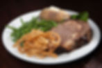 USDA whole roasted rib served with au jus sauce, vegetable, potato, salad or soup